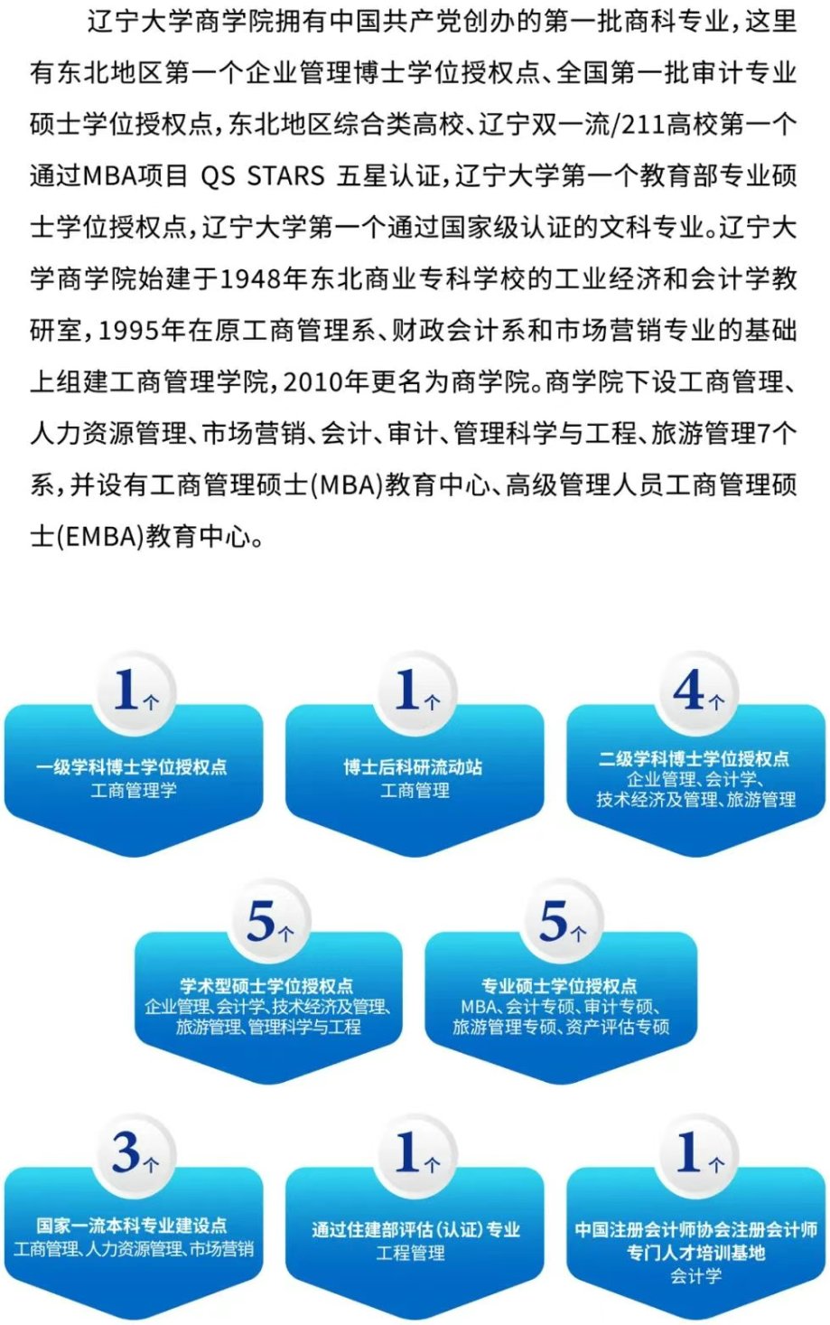 商学院MBA项目根植国家“双一流”建设和“211”工程重点建设高校辽宁大学,具有近八十年商科办学历史,是国内第三批MBA授权单位,累计培养5000余名高层次管理人才,校友广泛就职于银行、证券、大中型企业和政府事业单位等。MBA项目立足工商管理学一级学科博士学位授权点,工商管理学一级学科在教育部第四轮学科评估中位于B+层次,在2025年中国大学学科排名中处于B++层次。商学院MBA项目在央广网MBA教育年度盛典中获得“2024年度MBA卓越商学院”称号,在2025年获得QS Stars五星认证,是中国东北地区综合类高校首个、辽宁双一流/211高校首个获此殊荣的项目,同年,商学院成为AACSB成员单位,MBA项目国际化步伐不断加快。