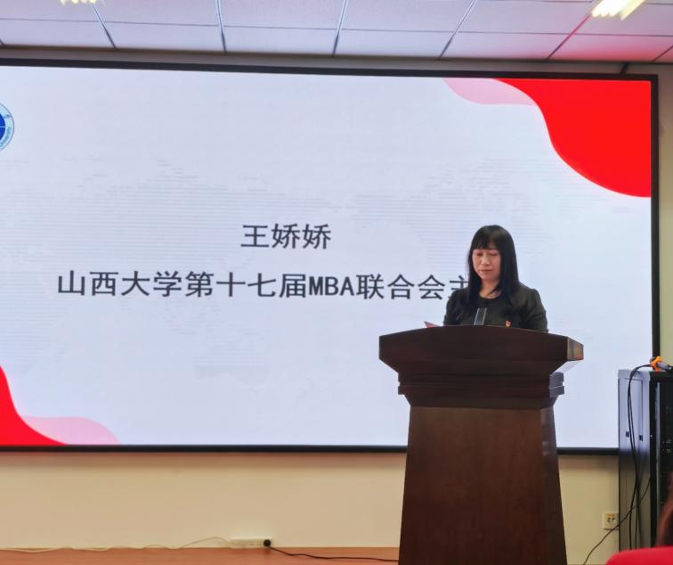 接着,山西大学第十七届MBA联合会主席王娇娇上台发言。她介绍了MBA联合会的职能与工作,表达了联合会将为新生们提供服务与支持的决心。她热情邀请新生们积极加入联合会,主动参与到各类活动和工作中,与学长学姐携手共建充满活力与凝聚力的MBA校园氛围,共同在求学路上收获成长与友谊。