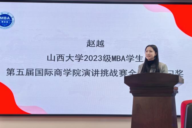 随后,2023级MBA学生、第五届国际商学院演讲挑战赛全国赛铜日奖获得者赵越作为校友代表发言。赵越同学分享了自己在山西大学MBA学习的经历与收获,分享了将课堂知识应用于工作实践的体会,以及参与各类活动所带来的成长与感悟。她鼓励学弟学妹们积极参与实践活动,把握在山西大学的每一个学习机会,勇敢追逐自己的梦想。