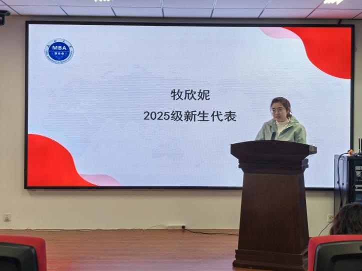 最后,2025级新生代表牧欣妮发言。她表达了对即将开启的MBA学习生活的期待与憧憬,代表全体新生承诺将以勤奋好学的态度、团结互助的精神,在山西大学经济与管理学院这个平台上,努力提升自我,实现学业与个人的双重成长,不辜负学院的培养与期望。