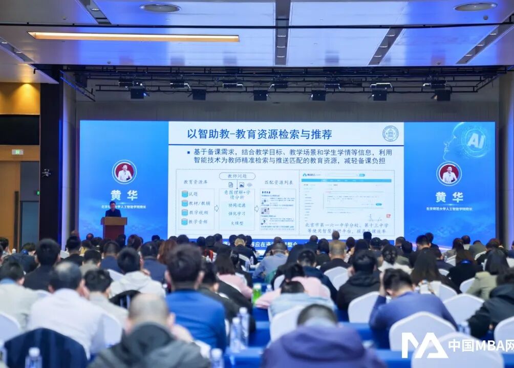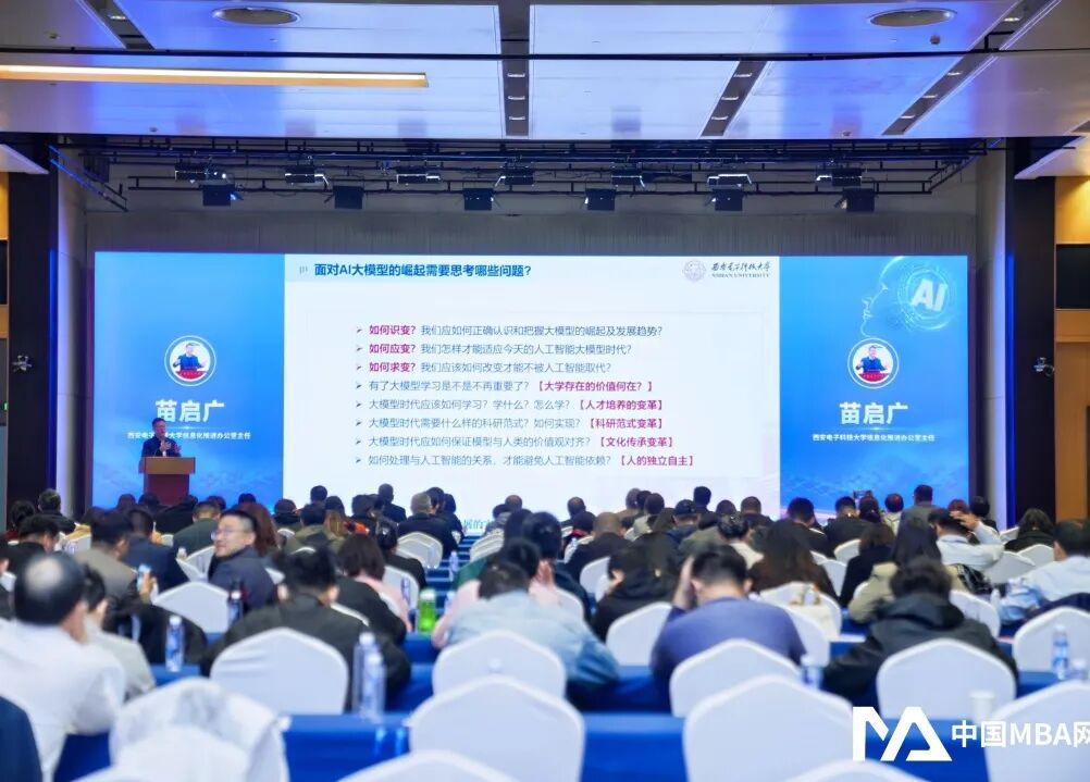 来自高校的三位专家聚焦“人工智能+教育”,分享了建设教育强国的生动实践,引发与会嘉宾的深入思考。北京师范大学黄华教授的分享聚焦AI赋能教育的底层逻辑。他梳理了全国“人工智能+教育”试点案例,系统呈现了人工智能+基础教育的赋能逻辑、实践样态及效能边界,为MBA教育提供了可借鉴的智能化改造思路。西安交通大学田高良教授从“人工智能+”行动顶层设计到产教融合落地,重点分享了MBA教育改革探索。他提出,要围绕系统、范式、机制三大创新方向,以国际化、特色化、融合化为未来发展路径,助力打造AI时代陕西MBA教育生态系统。西安电子科技大学苗启广教授结合西安电子科技大学自主研发的“慧通大模型”,分享了智能生成案例库、实时分析学情数据等AI嵌入教学全流程的样态,不仅为其他高校推进教育数字化提供了可参考的“西电方案”,也让MBA同仁们清晰看到了AI与高等教育融合的具体路径。
