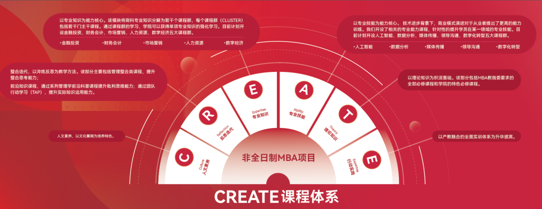 人大商学院MBA项目基于三十五年办学经验总结和学生不断变化的学习需求,项目围绕发展新质生产力,紧贴科技创新前沿,进一步探索教学理念和模式创新,扎根中国本土企业管理实践,建构中国自主的管理知识体系,构建了"人大商学院MBA全生命周期课程升级方案 "。 "CREATE课程体系",即以文化熏陶( Culture )为培养特色、以淬炼反思 ( Refection )为教学方法、以专业知识( Expertise ) +专业技能 ( Ability )为能力核心、以理论知识( Theory )为积淀基础、以产教融合的全面实训体系( Experience )为升华拔高,洞见、洞察、洞悉,充分发挥中国自主的知识体系在建构特色鲜明的MBA培养理念中的核心动能和推动作用,以科技创新驱动MBA培养高质量发展。