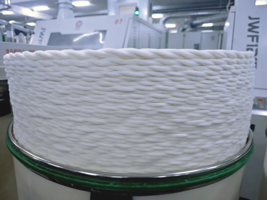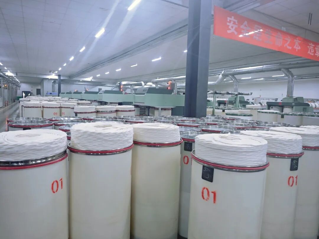 ,再到粗纱、细纱的完整纺纱流程。据海华纺织相关负责人王总介绍,该生产线配备了国际先进的纺纱设备,其中尤为引人注目的是空气捻接技术的应用,实现了单筒纱线长度超过10万米且全程无断头,充分体现了我国纺织产业的高质量发展水平。